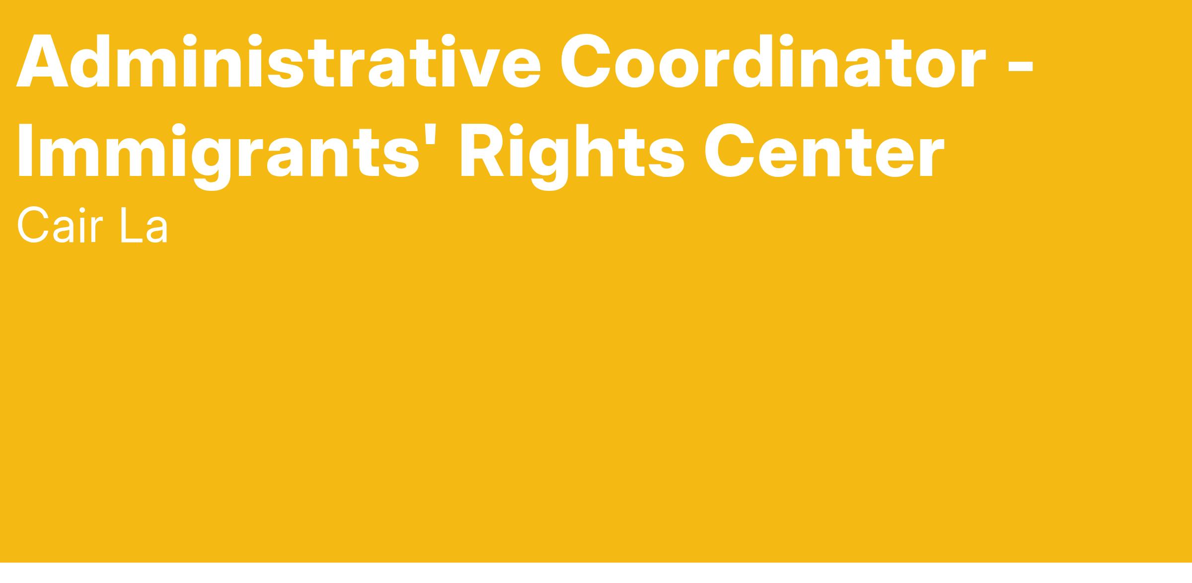 About the Role: CAIR-CA provides legal immigration services to refugees, asylum seekers, and the diverse immigrant community in California, The IRC Administrative Coordinator will report to the Senior Managing Immigrants' Rights attorney and is primarily responsible for providing administrative support to the staff. This person has excellent time management skills and experience working with a diverse set of clients. The IRC Administrative Coordinator supports the Immigrants' Rights Center team by handling daily administrative tasks and client communications.