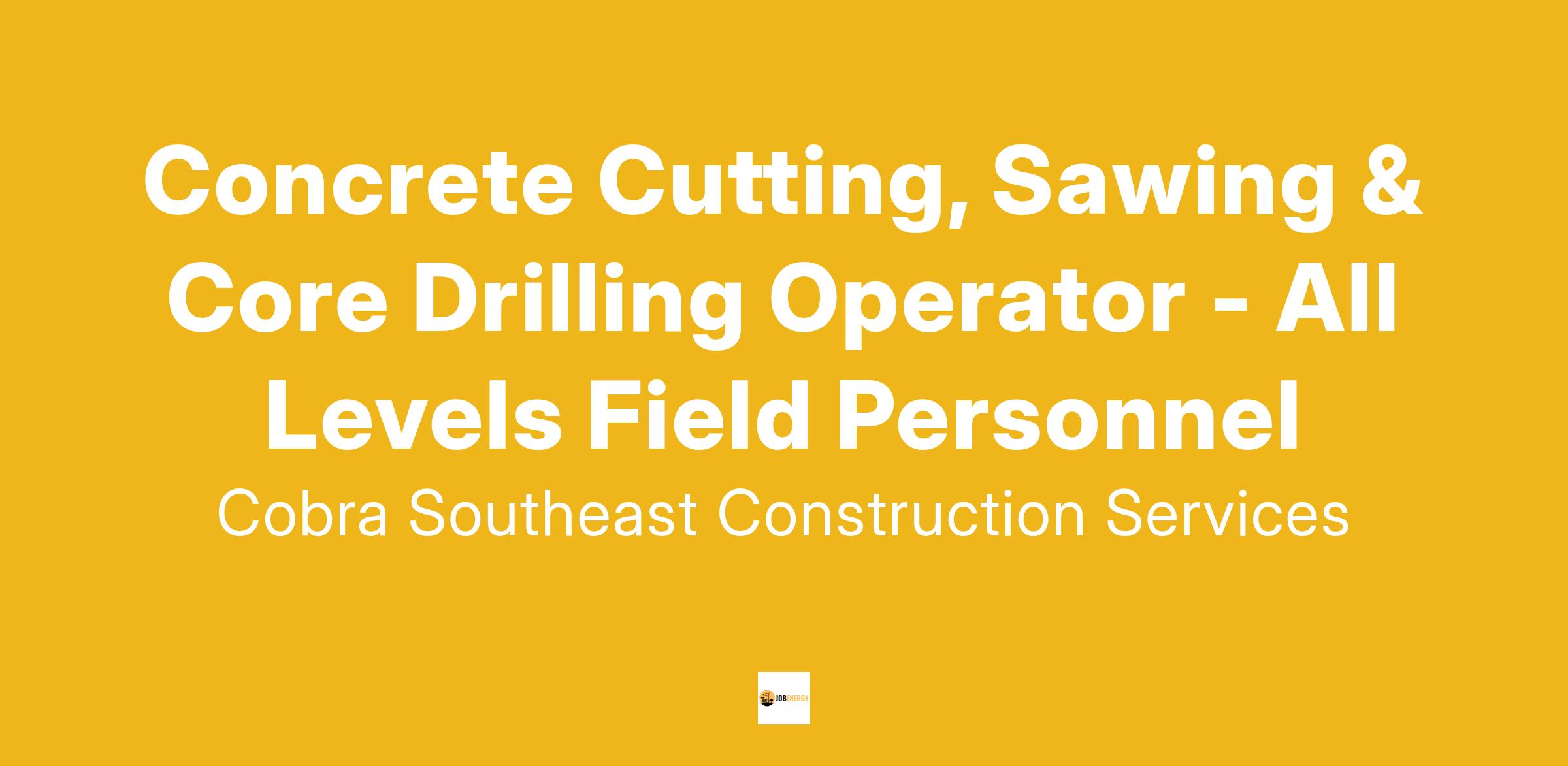 Cobra Southeast Construction Services is currently hiring Experienced Concrete Cutting, Sawing & Core Drilling Operator to join our team. For the right candidates, we have positions open in our new Southeast location, Atlanta, GA. This is a position for an individual who wants to be a part of our family. Our Atlanta manager has 28 years of experience, with 16 of those years as a lead Cutter. You will work very closely with management and will be given a very deep level of trust in representing our company. We promote from within; the opportunity to grow and develop in the trade is mandatory.