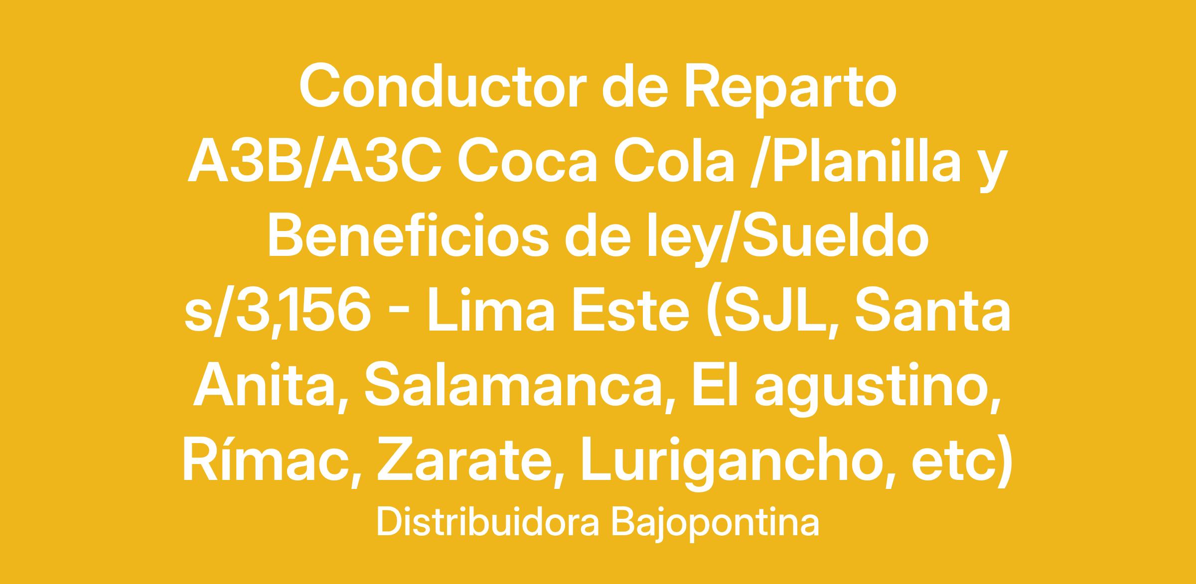 CONDUCTOR DE REPARTO PARA COCA COLA CON LICENCIA A3B y A3C para los siguientes distritos: Ate, San Luis, Santa Anita, Huaycan,Rímac, Salamanca, El agustino, Riva Agüero, Barrios, Altos, Cercado de Lima, Zarate Campoy, Huachipa, Chosica, Lurigancho.