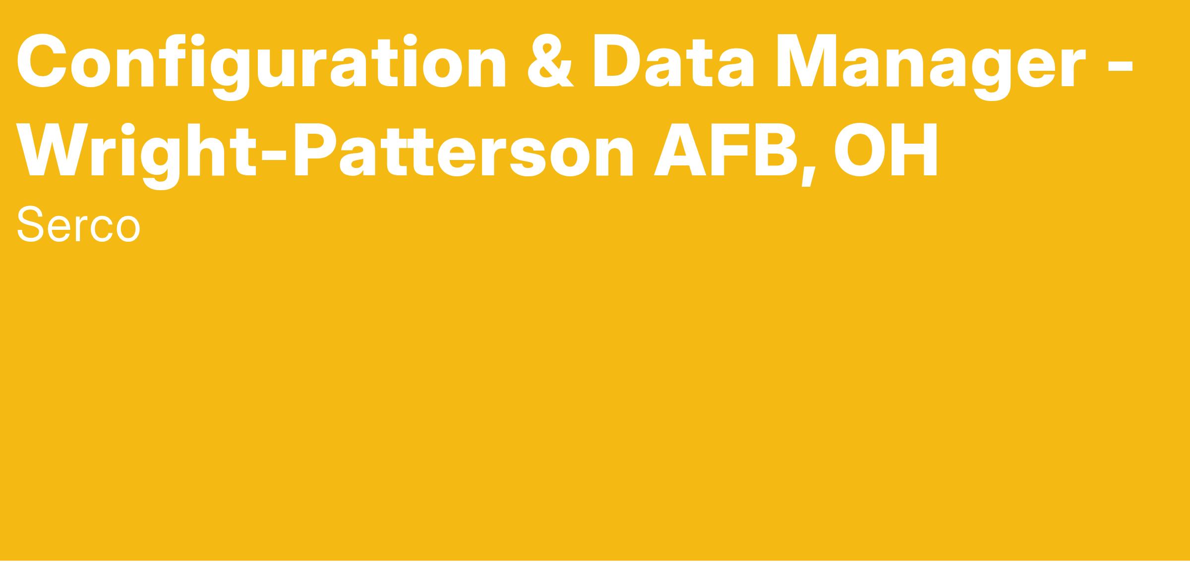 If you want to work on a cutting-edge Air Force program, Serco has a great opportunity for you! As a Configuration & Data Manager, you will be supporting the B-21 Strike Systems Division (AFLCMC/WBS) at Wright-Patterson AFB, Ohio.