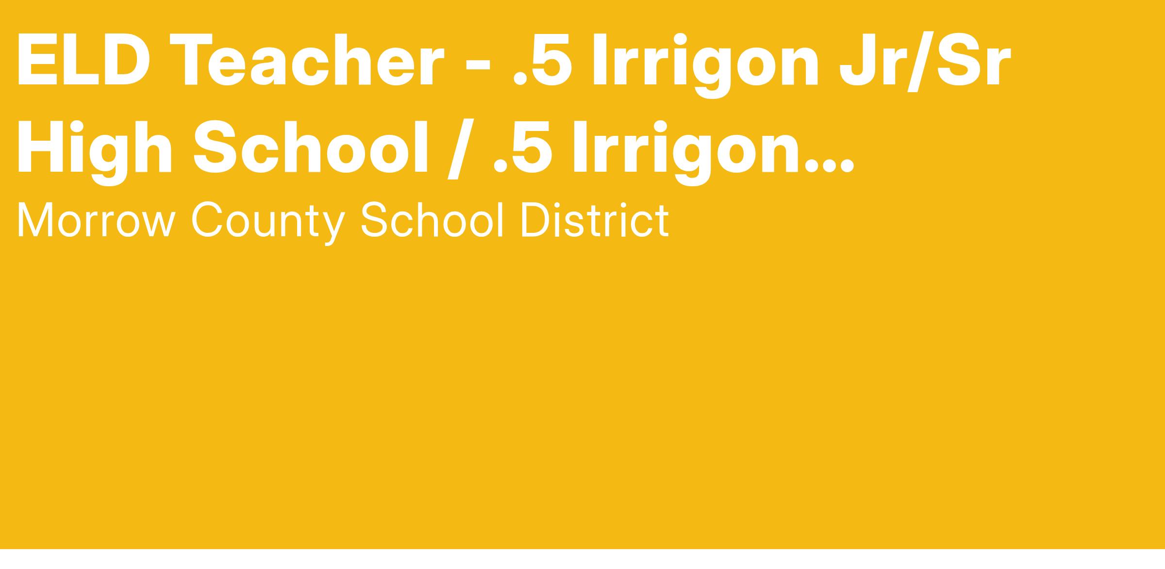 Morrow County School District has an opening for an ELD Teacher - .5 Irrigon Jr/Sr High School / .5 Irrigon Elementary School, in Irrigon, Oregon beginning with the 2025-26 school year. Candidate must possess or be able to obtain full Oregon licensure with proper endorsements and must be Highly Qualified.