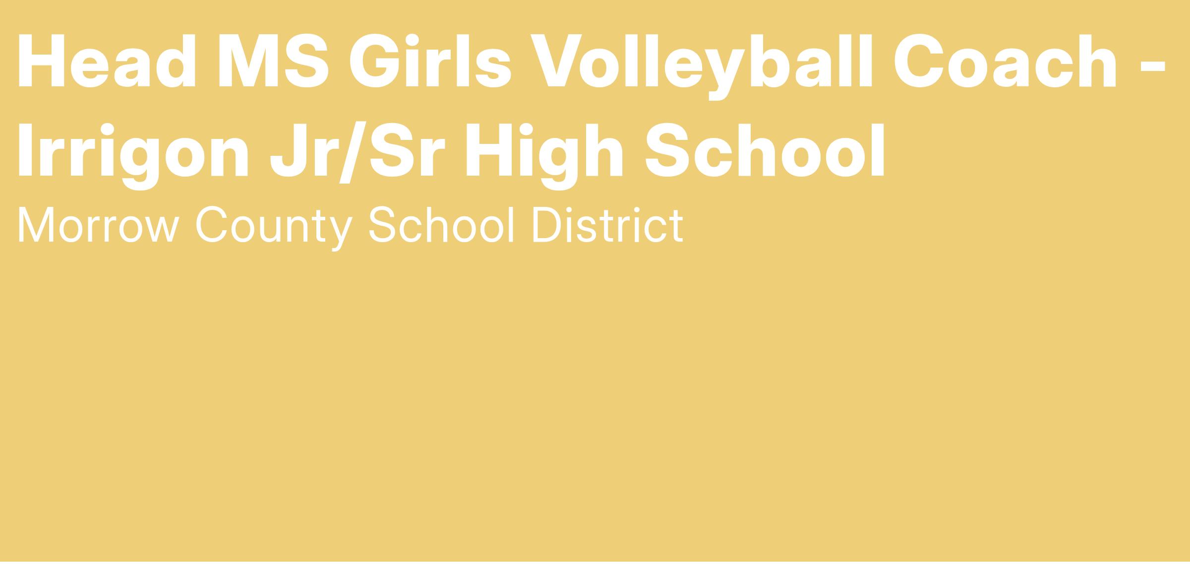 Morrow County School District is seeking a Head Middle School Girls Volleyball Coach for Irrigon Jr/Sr High School in Irrigon, OR beginning with the 2025/26 school year. Candidate must possess knowledge of volleyball skills/fundamentals and must have completed all OSAA required course work.