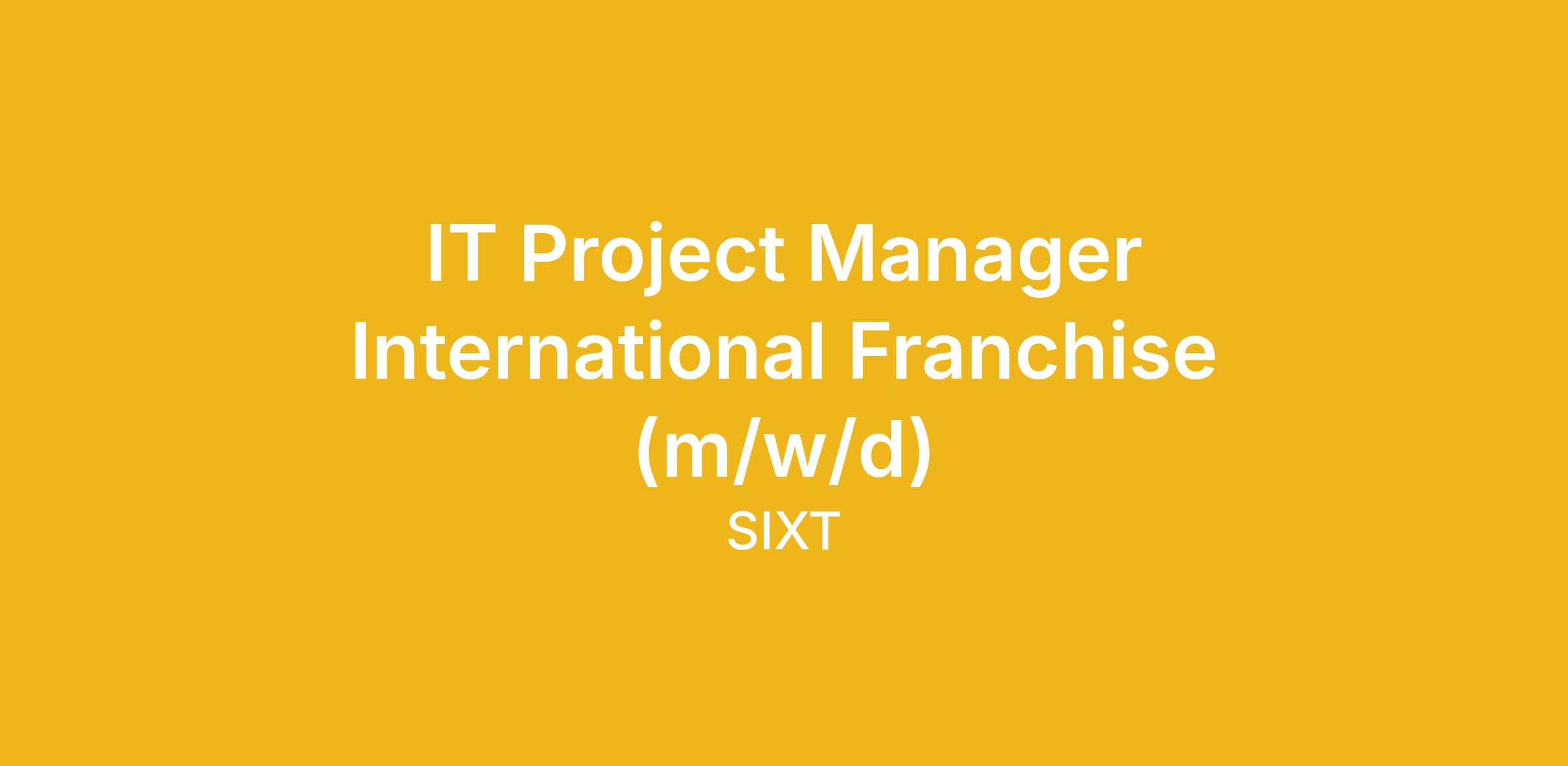 In dieser Rolle als IT Project Manager International Franchise (m/w/d) arbeitest Du eng mit verschiedenen SIXT-Technologieabteilungen und dem Franchise Operations Management Team zusammen, das mehr als 100 globale SIXT-Franchisepartner betreut. Du steuerst spannende IT-Projekte, die den Rollout verschiedener SIXT-Systeme wie unserer hauseigenen Mietwagensoftware an internationale Franchisepartner weltweit ermöglichen. Werde Teil von Team Orange und übernimm Verantwortung für spezifische Projekte rund um den Rollout und die Optimierung verschiedener SIXT-IT-Systeme im internationalen Franchise-Kontext.