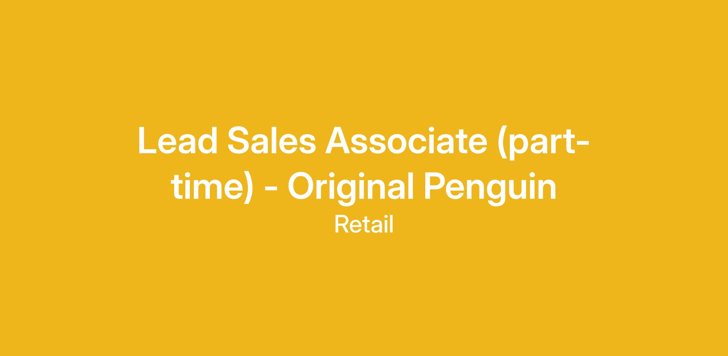 The Lead Associate’s primary function is to sell and promote Original Penguin (OPG) merchandise through execution of OPG customer service standards. The Lead Associate reinforces the Store Manager, ASM and Supervisors in ensuring the store meets its goals and standards in the areas of financial performance, customer satisfaction, and visuals.