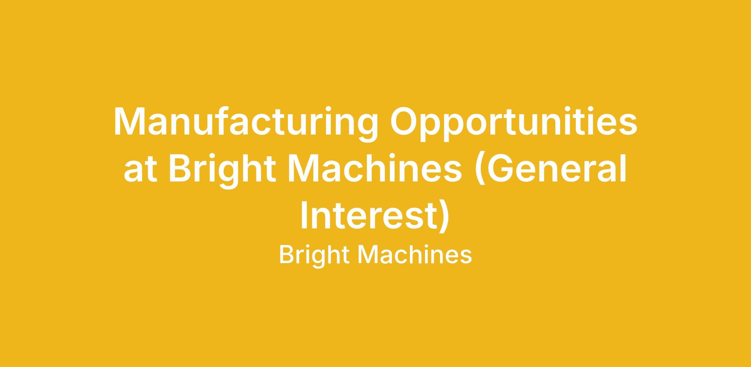 Bright Machines is always interested in connecting with manufacturing professionals who want to be part of the next generation of intelligent, automated production. Our CVG manufacturing site plays a critical role in building, integrating, and scaling advanced automation systems. While we may not have an immediate opening that matches your background today, we are continuously planning for future growth and would welcome the opportunity to learn more about you for upcoming manufacturing-related roles.