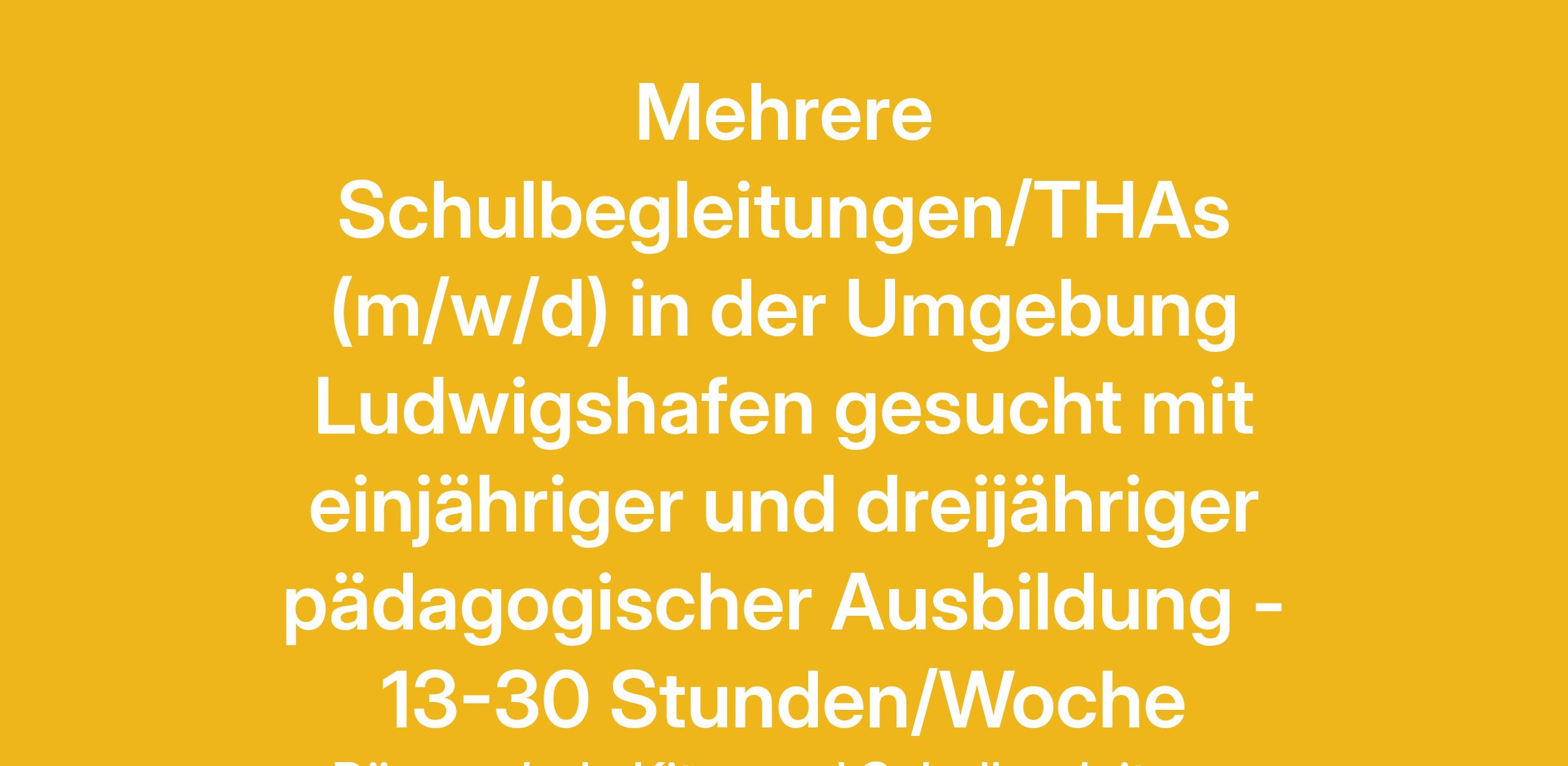 Zum nächstmöglichen Zeitpunkt suchen wir mehrere Schulbegleitungen in der Umgebung Ludwigshafen mit Stundenumfängen zwischen 13 und 30 Stunden.