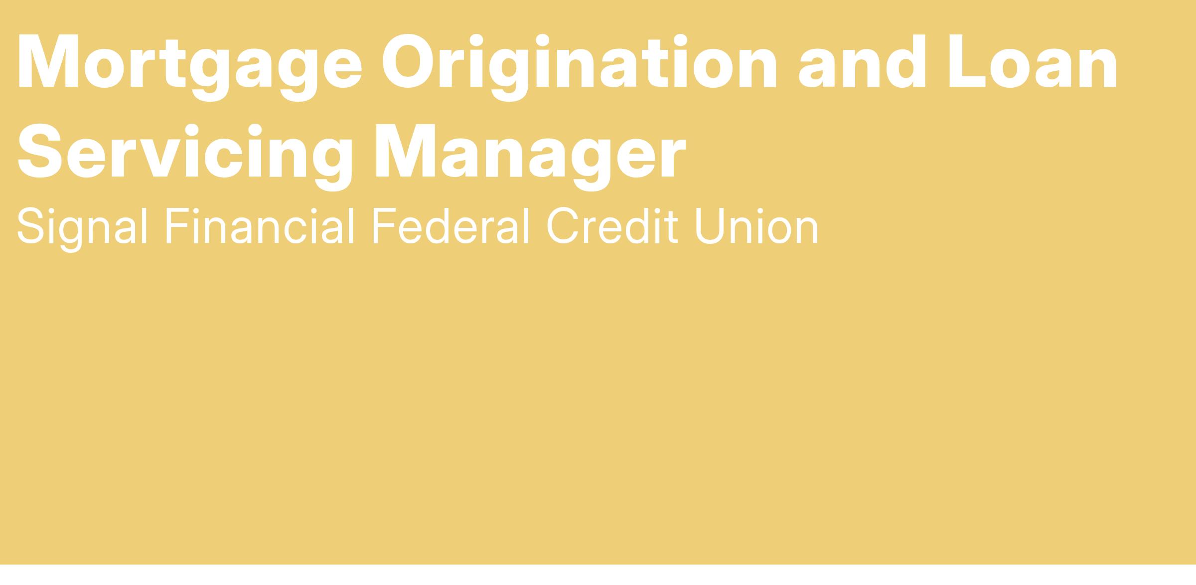 The Mortgage Origination and Loan Servicing Manager is responsible for the successful management of all aspects of real estate lending operations, from loan set-up through funding, for both first mortgage and home equity programs. The incumbent provides leadership, guidance, and support to the team, and ensures administrative and operational compliance with regulatory requirements and Signal Financial FCU policies and procedures. This role also oversees Loan Servicing functions for mortgages and consumer loans.