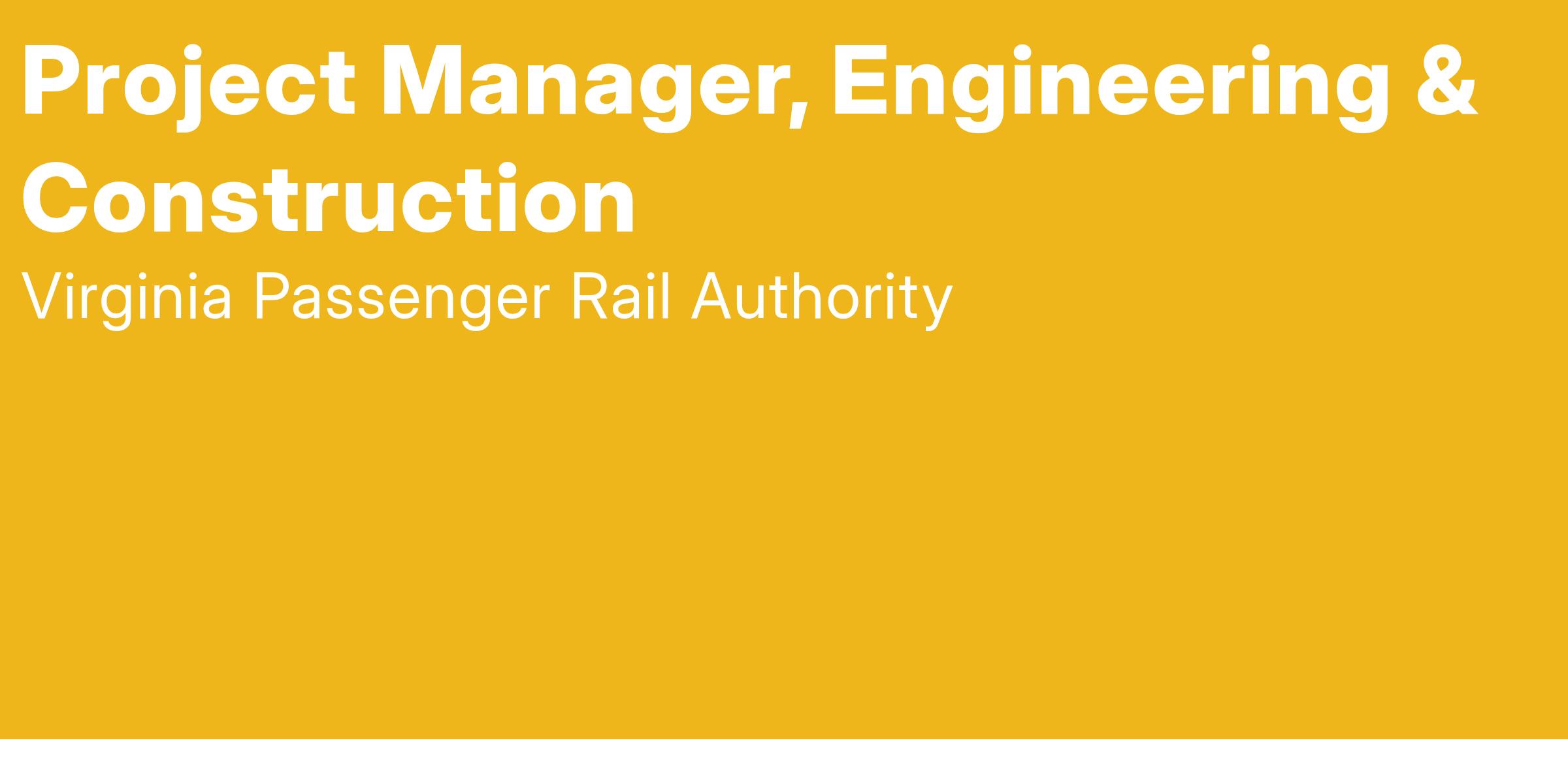 In addition to solid project management skills, the keys to success in this position will be strong organizational and planning skills, knowledge of design and construction, ability to monitor deliverables for adherence to client criteria, and execution of all business, technical, fiscal, and administrative functions. The Project Manager may also provide oversight support for projects implemented by Amtrak, CSXT, Norfolk Southern (NS), and the Virginia Railway Express (VRE). This position may be based in Richmond or Alexandria, Virginia.