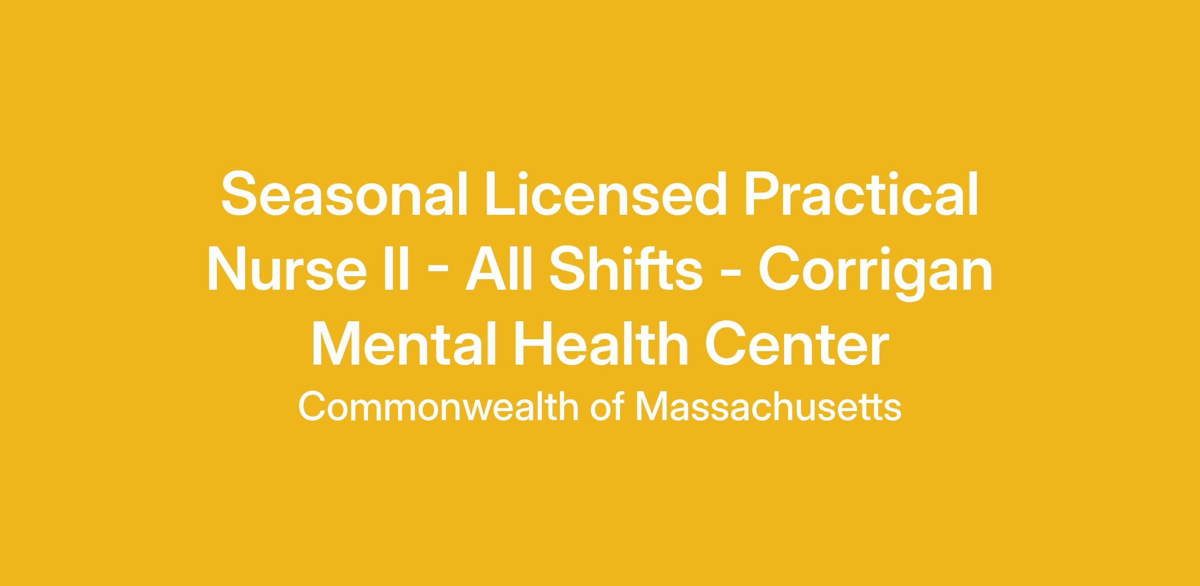 The Dr. John C. Corrigan Mental Health Center is seeking dedicated and compassionate individuals for the position of Licensed Practical Nurse II who desires a rewarding career making a difference in the lives of individuals. Our ideal candidate for this position will work with and assist other professional staff in providing day-to-day direct care to individuals on a 16-bed secured inpatient unit with serious and persistent mental illness, including monitoring patients, behaviors, providing direct care nursing care and patient teaching in regard to health and wellness, medication and illness management. The selected candidate will possess strong therapeutic interpersonal skills to encourage and motivate individuals in their recovery to work towards treatment goals.