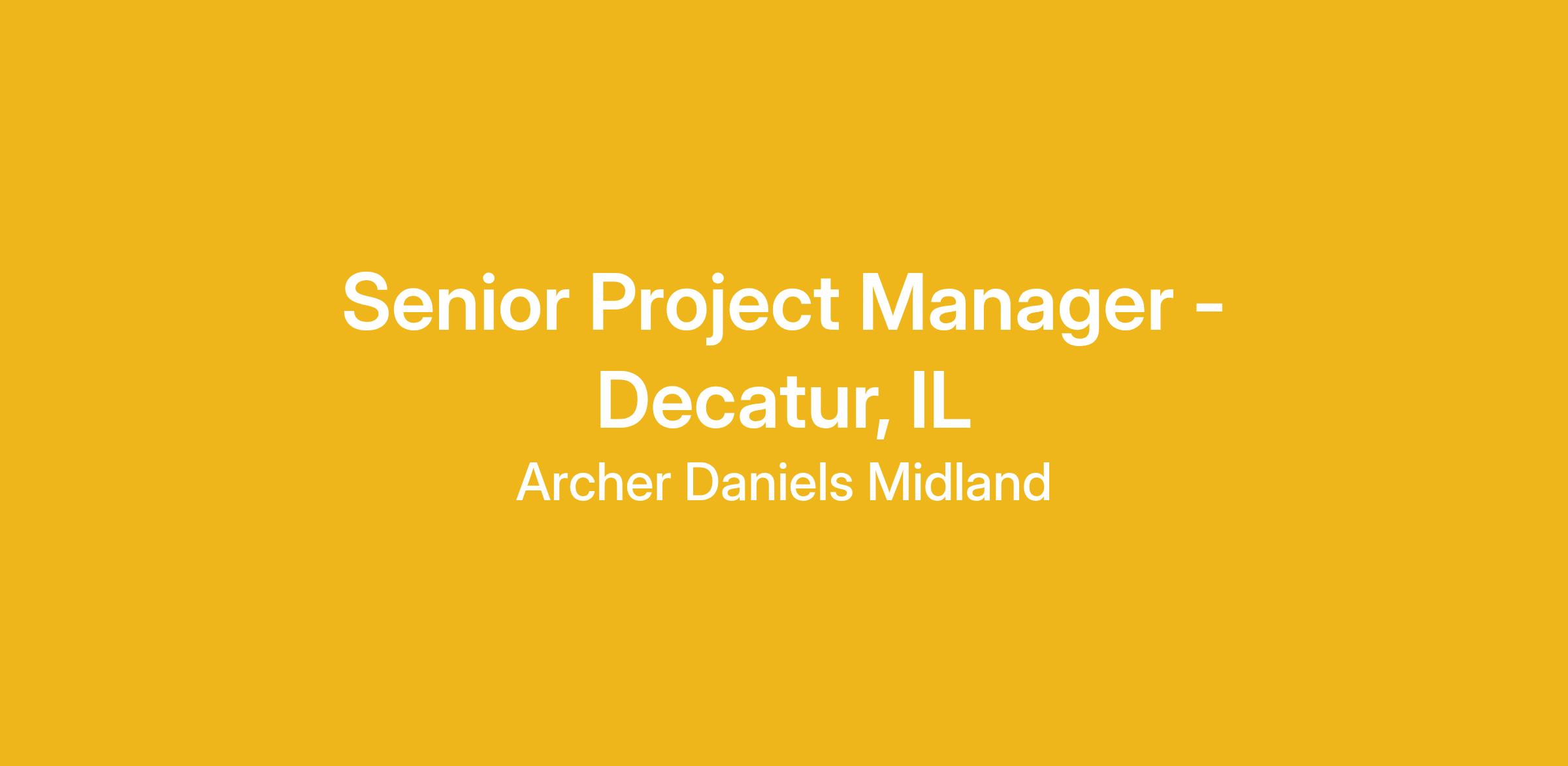 Senior Project Manager - Decatur, ILThe Department:The Strategic Project Management Office (PMO) enables the realization of benefits to ADM, through the delivery of projects and/or programs that have been approved and classified as ‘high priority’ by the designated authority within ADM. The Strategic PMO is the regional center of expertise in project and program management at ADM, whereby through best practice and functional knowledge value is created through project delivery.