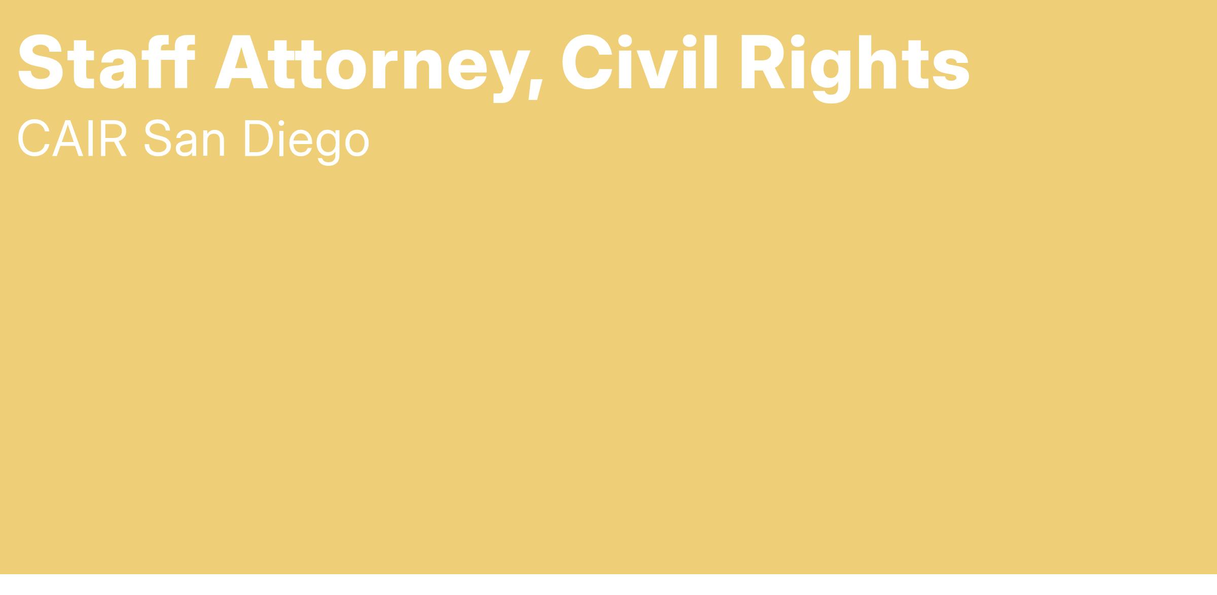 About the Role: The San Diego office of CAIR (CAIR-SD) is seeking a candidate who will demonstrate a commitment to public interest advocacy and serving diverse communities. The candidate will be a motivated individual with experience and interest in many different types of public interest law who will be expected to identify, strategize, and use creative legal and grassroots advocacy solutions to address systematic issues facing the American Muslim community. Practice Areas: Civil Rights/Civil Liberties (Religious Freedom), Employment, National Security & Law Enforcement Practices, Public Accommodations, Prisoners' Rights, School Issues, Hate Crimes/Incidents, etc.