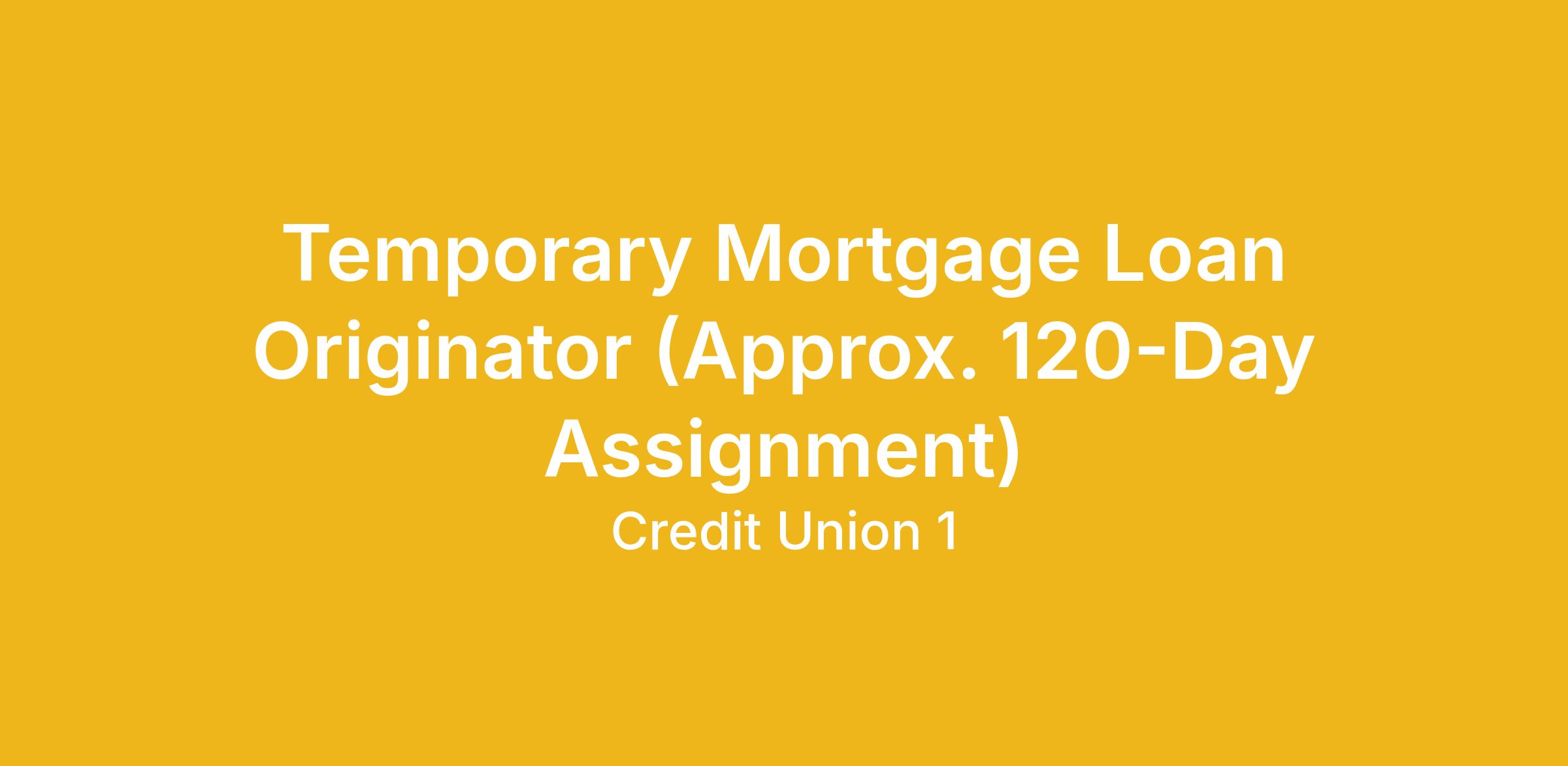 Credit Union 1 is hiring a Temporary Mortgage Loan Originator to support the lending team during a high-volume period. This is a Full-Time (40hrs a week) temporary assignment that is expected to last approximately 120 days.